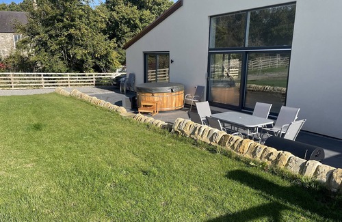 1 New Dairy Barn is a house consisting of a kitchen with electric oven and hob, microwave, fridge/freezer, dishwasher, kettle, and toaster, and a living/dining room with two sofas, TV, and dining seating. The bedrooms consist of a double with en-suite and four doubles. There is a shower room with walk-in shower, basin, and WC. WiFi, fuel, power, bed linen, and towels are included in the rent. Outside, there is an enclosed rear garden with patio, lawn, furniture, and hot tub, and off-road parking for four cars. Two well-behaved dogs are welcome. Sorry, no smoking. Enjoy a memorable escape to Durham at 1 New Dairy Barn. Note: Dogs must stay downstairs. Note: This property requires a Good Housekeeping Bond. Note: Building works ongoing nearby Monday-Friday 7.30am-4pm