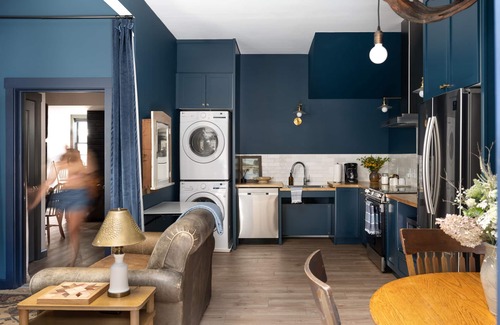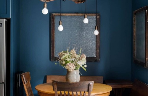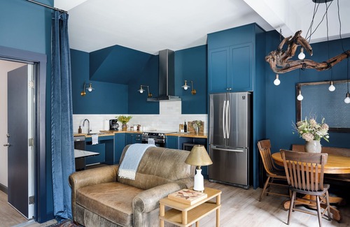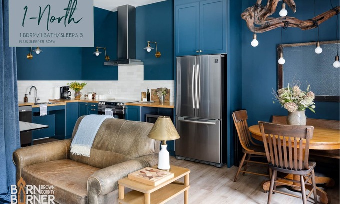 Discover 1-North at the Brown County Barn Burner, a cozy haven nestled in the heart of Nashville, IN, thoughtfully designed to provide comfort and accessibility for all guests. This ground-floor unit features rich, moody shades of blue, high ceilings, and timeless details, creating a serene and welcoming space.