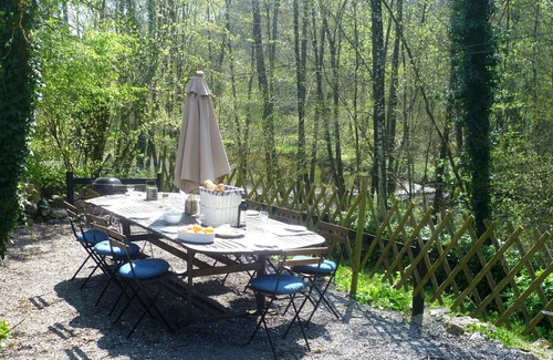 At the front, across the chemin is a large private dining/relaxation area for alfresco meals with table and chairs and a BBQ, shaded by our prolific Walnut Tree. Adjacent to this is a sunny grassed private seating area with chairs, table and parasols.