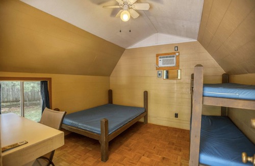 One Room Camping Cabin - sleeps 4. (No bathroom or kitchen) Are you tired of sleeping on the ground? Enjoy a cabin with air conditioning and real beds! 1 full-size bed, 2 beds (one twin-size bunk bed) Bring your own linens or sleeping bag. All the way in the back of the park near the catch release catfish pond! Pet friendly cabin, limit of two (2) pets. A $30 per pet, per stay pet fee will be added to your booking.