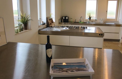 Directly on the Wadden Sea, vacation home Wadd en Zee offers modern accommodation for 22 people. It owes its name to the wonderful location directly on the Wadden Sea. You live here close to nature and far from neighbors, ideal for a quiet vacation, for small conferences or even as a rehearsal room for music groups. A house with three floors, on the first floor are living room, kitchen, and a bedroom (3 pers.) with private bathroom (whirlpool and two showers). On the 1st and 2nd floor you have a view of the Wadden islands Ameland and Schiermonnikoog. On the 1st floor are 5 bedrooms with private bathroom. One bathroom has a jacuzzi. On the second floor there is a passage room with 2 double beds (these can also be separated). On the 3rd floor is a passage room with two single beds. On the 8000 m² property you can be active outdoors. The cottage guarantees not only a nice vacation with the family, it can also meet business requirements. Bedroom 9 and 10 are located in an alcove and are separated by a screen.