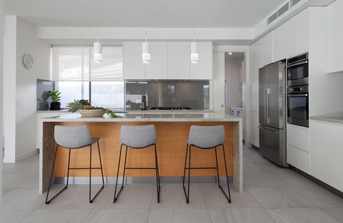 Contemporary interior design and stylish furnishings create a luxurious space for a relaxed coastal vacation. Spread over two generous levels, this beautiful home offers open plan living that seamlessly combines the kitchen, living and dining areas. The modern, galley style kitchen is complete with premium European appliances, stone benchtops, breakfast bar, and coffee machine – the perfect place to prepare relaxed meals with family and friends. The downstairs floorplan provides easy flow out through floor-to-ceiling glass sliding doors to the large outdoor entertaining area overlooking the sparkling inground swimming pool, and has an outdoor setting, dining table and BBQ for easy alfresco meals. Two living areas, plus a separate dining space offer abundant space for everyone to relax and unwind during their stay. The ground floor also includes a bedroom with ensuite, laundry and double lock up garage. Upstairs, guests can relax in one of four tastefully furnished bedrooms, including a master with ensuite, and share the use of the stunning main bathroom plus additional sitting room. With ducted air conditioning and ceiling fans throughout, a separate powder room downstairs, Wifi, Foxtel, 2 x 50 inch Smart TVs and onsite parking for up to four vehicles, this fantastic home is the absolute total package when it comes to the highest quality beachfront vacation properties.