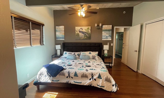 This detached house in a quiet neighborhood and will sleep 7 in (2) Kings, Queen plus a single day bed.