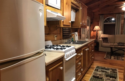 High Country Haven Camping and Cabins is a beautiful back to nature mountain experience. Located in Franklin NC 7 mins to downtown. 35-45 minutes to Bryson City, Dillsboro and Sylvia. This one bed queen one full bath with shower and tub cabin is the perfect getaway for a clean and cozy stay! Full kitchen, dining room and living room. Can sleep one extra person on couch or we have a queen blowup mattress you can use for extra sleep space in the living room. You will find cabin lodge decor welcoming to the mountains for you stay.