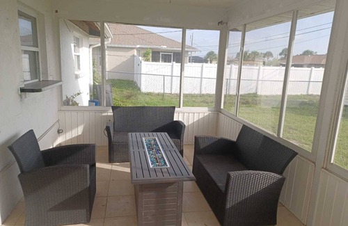 Unwind in Englewood at this peaceful house. With 2 bedrooms, including 1 king bed and 1 queen bed, guests can enjoy a tremendous living room with an additional king bed. Pets are welcome. This excellent property offers amenities like a hair dryer, AC, an iron, heating, a garage with 50 amps to plug in your electric car, and a fire pit in the lanai. Experience the magic of Englewood at our cozy house.