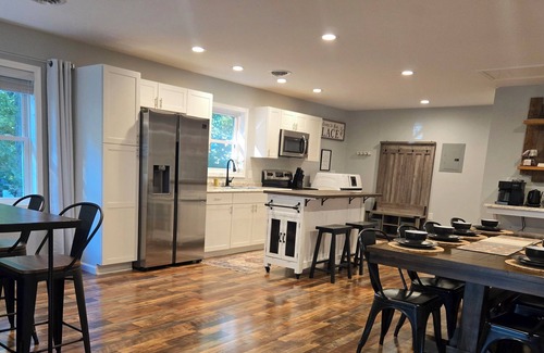 This charming retreat is equipped with everything you need for a memorable event. Enjoy high-speed Wi-Fi and dedicated workspaces if you need to catch up on anything before or after your wedding. The open-concept design boasts a large kitchen table ideal for gatherings, two Samsung Smart TVs for entertainment, and cozy Tuft and Needle Queen beds for restful nights. In addition, the outdoor space features a new fire pit, perfect for intimate gatherings under the stars, and a playset to keep little ones entertained during your festivities.