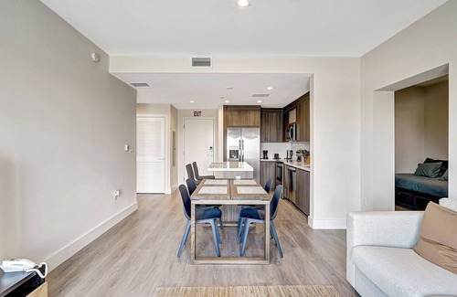 Experience Hollywood, FL from our modern 2-bedroom condo with a king-sized master suite and a cozy den with a daybed. Enjoy morning coffee or evening sunsets on the private balcony. Stay connected with free Wi-Fi and unwind with a Smart TV. Located just a 10-minute drive from the beach and vibrant local attractions. Ideal for a serene getaway!