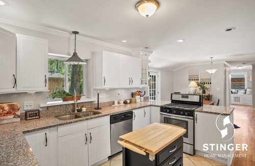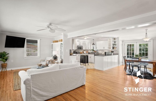 Your stay includes a spacious layout featuring three cozy queen beds and two bathrooms in the main house, complemented by a private guest house offering an additional queen bed and full bathroom. The fully equipped kitchen is ready for any culinary endeavors, whether you're whipping up meals for guests or preparing snacks for your wedding day adventures. Elegant French doors lead to a large outdoor area, ideal for pre-wedding celebrations or casual get-togethers, making it a wonderful setting to enjoy the beauty of South Carolina. Pets are welcome, allowing every member of the family to be part of your special occasion.