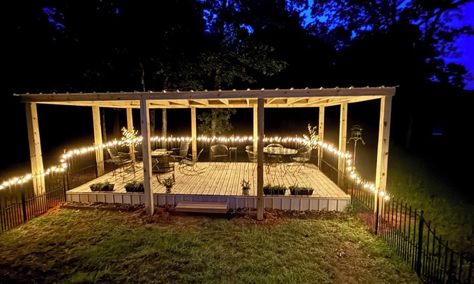 - Spacious Outdoor Areas: Enjoy serene moments together at the expansive four-acre property, featuring inviting porches, a fire pit with rocking chairs, and outdoor games like horseshoes and corn hole.