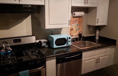 You can be downtown, north or south Austin in 10 minutes. High speed internet. New 65" mounted 4k Smart TV. Full equipped kitchen with dishwasher. Comes with everything you need for short or long stays.