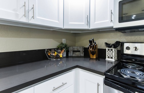 The very popular property includes a fully furnished full size kitchen, new cabinets and gorgeous new quartz countertops. All appliances are stainless steel including a built in microwave, a full size side by side refrigerator with ice maker, in door filtered water, stove and dishwasher. All dishes, cookware, utensils, glassware, etc. are provided. There is lots of cabinet space and a large pantry for all of your food items. Included inside the unit is a new Samsung stacked washer / dryer. Enjoy your coffee, lunch or afternoon wine and cheese at the breakfast bar, where there are three bar stools, it even has dimmable pendant lighting for just the right ambiance you are looking for. The space is designed as an open plan from the kitchen which provides for open space to a comfortable living room with a sectional sofa and club chair with ottoman perfect for curling up with a good book. Or relax while watching the flat screen television with Roku for streaming your favorite programs, and recording your favorite shows. For your work space furnishings include a desk with desk chair and lamp.