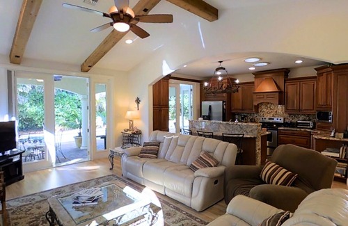 Our veranda and large lap pool area is an all-time favorite, for taking siestas in the poolside hammock or the outdoor daybed. It is also wonderful for grilling and beautiful outdoor dining, or just for relaxation and conversation in the comfy padded swivel chairs. We are pet friendly.