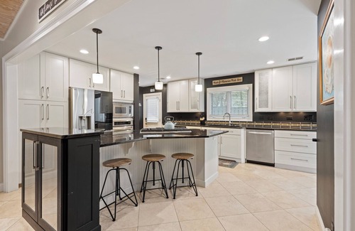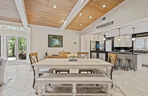 Calling all foodies! The chef's kitchen features high-end appliances, a gas range, and a stunning oversized island, so you can prepare meals with ease. The adjacent dining space comfortably seats 6, and additional seating at the island makes for the perfect breakfast nook. For those who love dining al fresco, enjoy meals at the outdoor dining area located on the screened poolside deck.