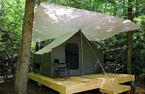 Your site has a 12 X 16 wooden platform on which a 10 x 10 cabin tent is set up complete with a full sized bed, bedding and pillows. The interior has rugs, two small tables and a book shelf and chair. A white tarp is above the tent and deck area to give extra protection from rain and give one a place to sit and enjoy thunderstorms! The deck has two chairs. Solar lights give atmosphere. Picnic table and fire pit are situated slightly below the tent in a private, woodsy open area. A small charcoal grill is provided (but no charcoal), and a selection of utensils and "pots and pans" for use with the grill are on site. Some water and campfire wood is provided.