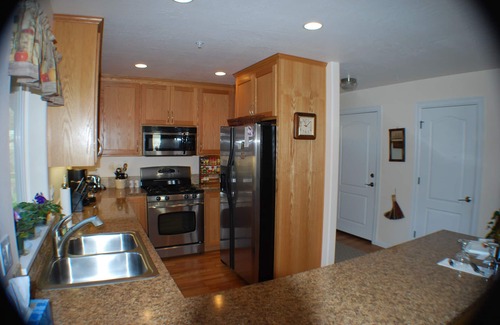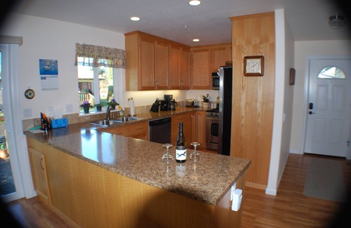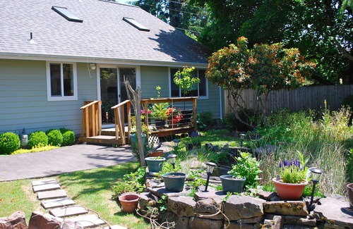 Well behaved pets accepted. No hot tub. This spacious two bedroom, two bath home was built in 2009 and has all the modern conveniences. Unlike many homes in Eugene, this home IS AIR-CONDITIONED! Large great room has gas fireplace, 65" flat screen, sky lights and sliding door to deck. The fully equipped kitchen features new appliances and everything you need to feel at home. Sit on the deck and watch ducks occasionally land in the pond right outside your door. There is convenient ADA access throughout for guests with disabilities and the home is all on one level. Plenty of room for extended family or two couples, each having their own room with queen beds. Two others can find a queen sleeper sofa in the spacious great room. You will love this quiet, safe and convenient setting approximately 3.5 miles from University of Oregon campus, 2.2 miles from Autzen Stadium/PK Park where the Ducks play football/baseball & Matt Arena for basketball fans. Enjoy the comforts of home away from home and be together instead of the expense of 2 hotel rooms and no kitchen. Plenty of free parking too!
