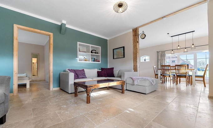 Unser lichtdurchflutetes Haus an der Wieke vereint geschichtsträchtige Eichenbalken mit Industrial Style. Der Natursteinboden und die beruhigenden Farben schaffen die perfekte Wohlfühlatmosphäre; und mit dem gemütlichen Holzkamin lässt sich die Zeit zum Ausspannen auf dem Sofa wirklich genießen.