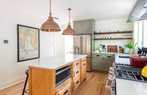 In the kitchen are white Quartz countertops, reclaimed wood open shelving, Café quality stainless steel appliances, Granite non-stick cookware (full set), Moccamaster gourmet drip coffee maker, Dutch oven, retro Haden designer toaster, Chef's cutting board and knife set, plenty of serving and mixing bowls, wine decanter, baking sheet/pan set, blender, and more. The kitchen was outfitted by people who like to cook, and we've chosen items that we personally use and love in our own homes!