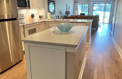 COMPLETELY RENOVATED and CLOSEST GREENS VILLA TO BEACH! 105 The Greens is clean and has a Bright and Cheerful Open Concept Kitchen and living area. Enjoy the HHI active lifestyle and beach living with all the comforts of home including a desk area to work effectively while remote.