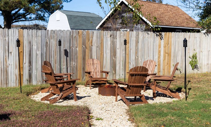 ✦ Unwind on the patio with six Adirondack chairs, surrounding a fire pit perfect for cozy evenings.