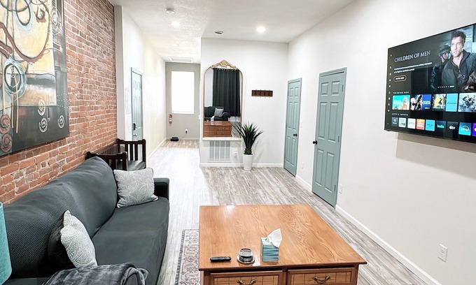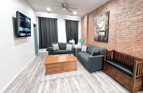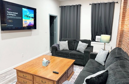 • Living Room: Relax in a spacious, cozy living area with plush seating and a large flat-screen TV. The exposed brick wall gives the room a touch of rustic elegance, ideal for a night in or socializing with family and friends.
