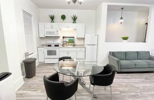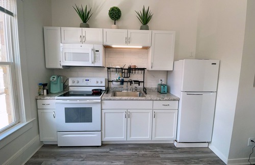 • Fully Equipped Kitchen: Features white cabinetry, an electric stove, microwave, full-sized refrigerator, and essential cookware, so you can easily prepare meals during your stay. Potted plants and a thoughtful design give it a charming, welcoming feel.