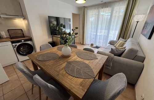 Beautiful tastefully renovated apartment on the 1st floor in a *** star rated residence. This apartment consists of two bedrooms (1 160cm double bed and 2 single bunk beds), an equipped kitchen area open to a living space, a bathroom and a separate toilet, a beautiful terrace with garden furniture. A parking space. Residence with heated swimming pool, tennis, a city park for young and old, pétanque. Supplement: wellness area (sauna, hammam), laundry. Deposit to be paid on site. Holiday vouchers accepted.