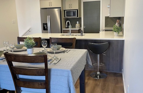 High end kitchen fully stocked. Laundry. Primary bedroom w/ king size bed and large ensuite, walk in closet. 2nd bedroom w/ queen size bed. Living room - queen size sofa bed.