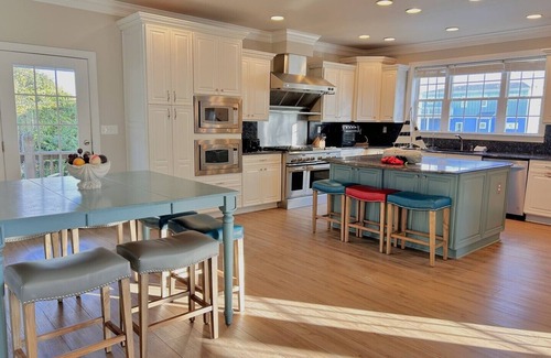 - Gourmet Kitchen: A fully equipped chef's kitchen with stainless-steel appliances and a large island breakfast bar is perfect for meal prep and catering options for your wedding events.