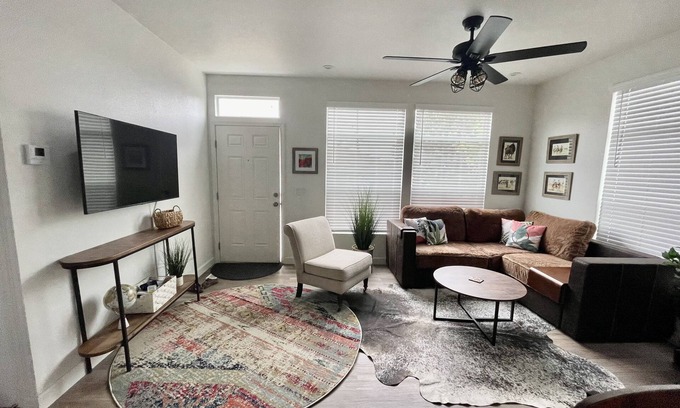 Welcome to your cozy suburban retreat located in a quiet neighborhood across from a lovely city sports park with 2 soccer fields, 1/2 mile walking track, racquetball courts & more! This 2-bedroom, 1-bathroom home is designed to provide you with comfort and convenience, making your stay truly exceptional.