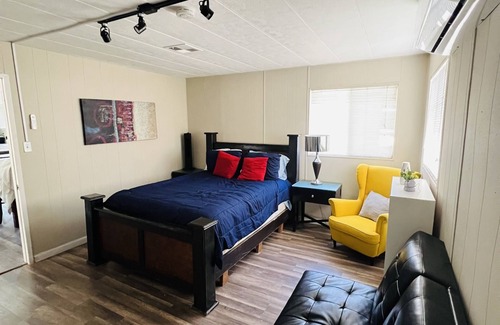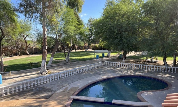 Welcome to this charming farmhouse in Mexicali. This superb property offers a serene and marvelous retreat for guests. With 3 queen beds, 2 twin beds, and 1 bunk bed, there's plenty of space for everyone to unwind. The living room features 5 sofa beds, providing additional comfort. Stay connected with WiFi, enjoy the cool AC, and take advantage of the iron and washing machine. With 2 bathrooms. We also count with Pool, outdoor kitchen with grill, rockola, swimming Pool, playground. Whether you're exploring the city or simply relaxing in the cozy farmhouse, we'll be available to answer any questions while you stay at our place.