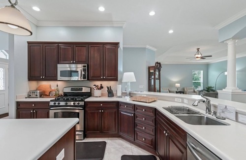 Explore the lanai/birdcage area to find an outdoor oasis with a refreshing pool—a perfect escape from the Florida sun. Enjoy alfresco dining experiences at the outdoor kitchen (grill not provided) while taking advantage of additional seating options.