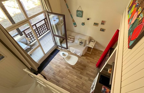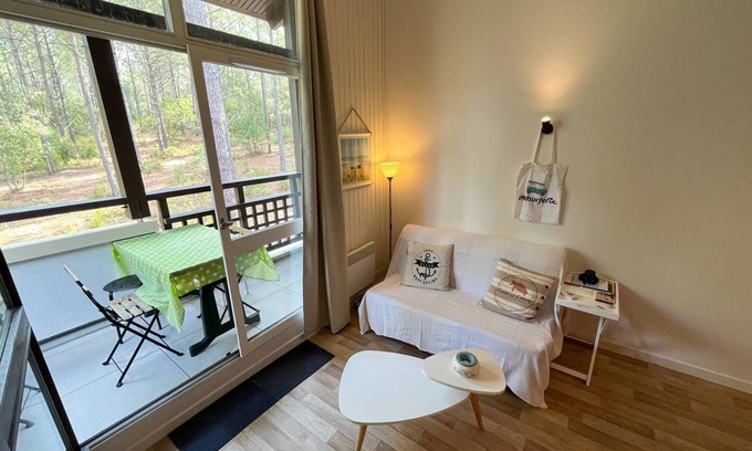 This nice apartment of 28m² is composed on the ground floor of an entrance, a fully equipped kitchen (oven, microwave, washing machine, freezer) open to the living room opening onto a terrace with a direct view on the forest, as well as a large bathroom with bathtub. Upstairs, on the mezzanine, a spacious bedroom with 1 double bed of 140 cm.