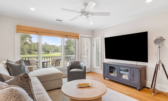 This Kiawah Island vacation rental is a second-story, two-bedroom villa. Guests will enjoy the deck overlooking the golf course and the short 5-minute walk to the beach.
