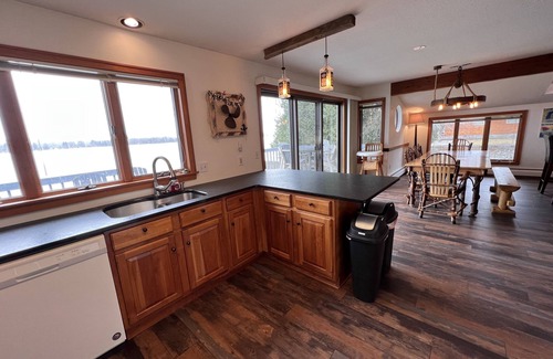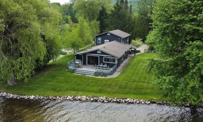 "The 45th Corner" is a spacious home with a beautifully landscaped lot, situated on the corner of 140 ft. of private Intermediate Lake frontage and a canal. Property's GPS coordinates fall 0.3 miles off the 45th parallel. This vacation retreat is a great location to enjoy fishing, boating, swimming, or just relaxing by the fire and enjoying the view.