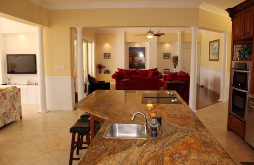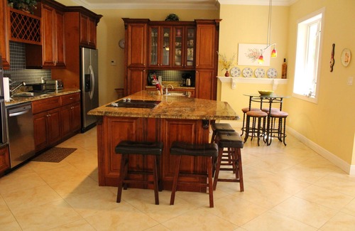 A huge open-plan space at the center of the house and leads into the TV Entertainment Lounge, the Formal Relaxing Lounge and the Dining Room. The close proximity to these other rooms allows the whole family or group to relax or do different activities but without being separated. The large island with granite counter-top serves as a meeting place for all guests. Ample seating is available - stools at the breakfast bar and stools at the round glass table (and a high-chair is available upon request at no extra charge). This makes it a great place to have breakfast altogether, mix drinks, and chat.