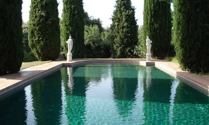 There is a 16 meter long by 8 meter wide swimming pool surrounded by cypress trees.