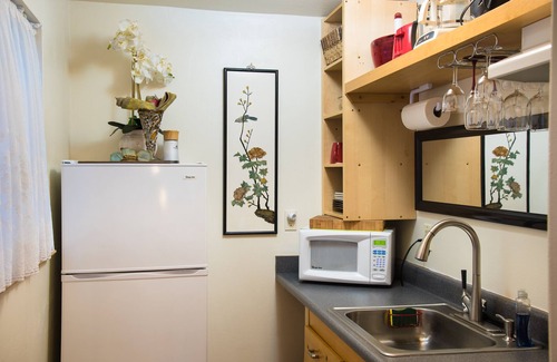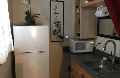 Separate Studio Cottage has queen bed with Full Kitchen and Bath with Tub.