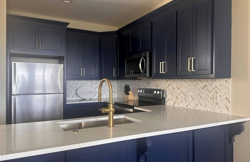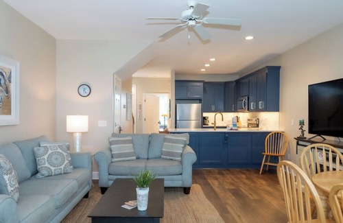 Step inside and enjoy the open-concept living, kitchen, and dining areas, perfect for entertaining after a day at the beach. The living room features a 65" TV, ideal for movie nights or catching the big game. The fully equipped kitchen makes it easy to whip up vacation meals, while the nearby dining area is great for family feasts or sunset snacks.
