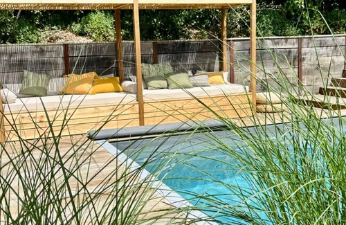 Accessible from the outside: a separate studio consisting of a bedroom with its own private bathroom. Outdoors designed for relaxation: Terraces furnished with garden furniture, a private pool with benches for lounging in the sun, a bowling alley, and a ping-pong table.