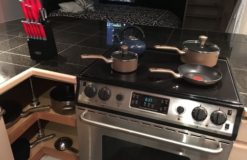 The condo is fully furnished and offers "oversized studio" or "open space" accommodation. It has a well-maintained Stainmaster carpet throughout the condominium. Please be gentle with relatively new furniture (High definition TV, sectional sofa, ottoman, bed, chest of drawers, nightstand, chairs, lamps, work table, throw pillows, wooden serving tray, vacuum cleaner, etc.) and kitchen equipment (pots, pans, plates/glasses, utensils, set of knives, coffee maker, toaster, microwave oven, tea kettle, expansive granite counter, maple cabinets, etc.). Matching kitchen appliances (Frigidaire Gallery Model) and the huge maple bookshelves should be handled with utmost care.