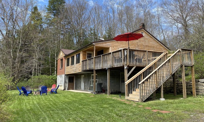 16 acre retreat located near Summersville Lake and short drive to Fayetteville and the New River Gorge. Property has many unique features such 1.5 acre pond and a butterfly meadow perfect to wander the afternoon away. Recently renovated to open the house up to have more open space and enjoy the new windows. Newly renovated bathrooms include a large soaking tub. Linens, towels, and other essentials provided for your stay.