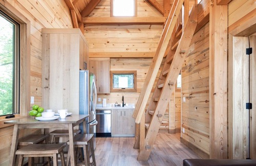 Discover peace in nature in this enchanting timber frame cabin surrounded by mature oak trees and peaceful lake views. 400 acres of hiking trails, two stocked lakes, and nearby attractions, this cabin will take your next vacation to a new level. Our two-bedroom cabin has the amenities you need including High Speed Internet and a wood burning fireplace. The Cabin comes equipped with a fully stocked kitchen. This cabin is PET FREE