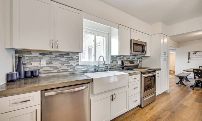 A living room and a ceiling fan are featured at this 3-bedroom, 3-bathroom rental. Prepare a home-cooked meal in the kitchen, complete with an oven, a stovetop, and a dishwasher, as well as a microwave, cookware, and paper towels. Other amenities include bed sheets and heating.