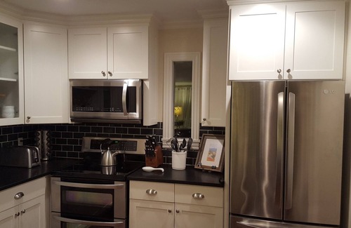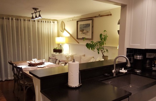 The main floor family room has 2 story wood ceilings. This room comfortably seats 8 with its L-shaped linen colored slipcovered sectional, comfy reading chair/ottoman and a coffee table that is accessible to all. A TV with Roku stick is located on the entertainment center. The dining room seats up to 8 (if you use the banquette) and has a reclaimed wood farmhouse table, banquette seating and 6 chairs. The kitchen features mat black granite counter tops, Shaker style white cabinets, Atlantic blue glass back splash, a stainless-steel farmhouse sink and stainless-steel appliances. The laundry room has a stainless-steel front-loading washer and dryer. The 1st floor powder room has a sea inspired tile floor, wainscoting, grass cloth wallpaper, and a large farmhouse sink.