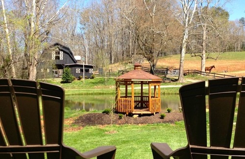 A Cottage at Willow Pond Stables awaits you in a tranquil setting on a 17 acre farm where you can rest, relax and enjoy the majestic beauty of horses just out the front door. Also tour Asheville, Biltmore Estate, Hendersonville, Black Mountain, and experience all the activities and scenery Western North Carolina has to offer. Have lunch at the Picnic Table, relax in the 6 person hot tub, swing in the hammock under a shade tree, watch the water rippling on the pond while sitting in Gazebo, observe horses grazing....That’s right….you will experience nature from the leisure of this cozy cottage. Bring your fishing pole and try your luck at catching a fish. Pamper yourself in the privacy of this fully furnished 2 bedroom, 2 full bathrooms cottage with one level living space of 1200 sq. foot. Comfortable & luxurious king and queen beds await you dressed with fine linens. Throw something on the BBQ grill, take advantage of your fully equipped kitchen for those home cooked meals or take a 5 minute drive to the areas many restaurants and Movie Theater! Your kitchen includes a refrigerator with ice maker, electric cook-top with oven, dishwasher, microwave, coffee pot, toaster oven and all the cooking utensils you may desire. Be mesmerized by the crackling of your wood burning fireplace. Just relax ….listen to your favorite tunes or enjoy a game or puzzle on your warm hardwood floors. When all is quiet grab a book and head to the rocking chairs on your covered front porch & enjoy the sunrise or set. Don’t forget to look up every now and then to enjoy the horses romping in the distance. Conveniently located: 2 miles from I-26 Exit 37 at Biltmore Park~6 miles from I-40~ 4 miles to the Asheville Airport & WNC Agriculture Center~12 minutes to Biltmore Estate~15 minutes to downtown Asheville & Hendersonville Keywords: Cottage, one level, 2 Bedroomm 2 Bath, Covered Porch, Enclosed Porch