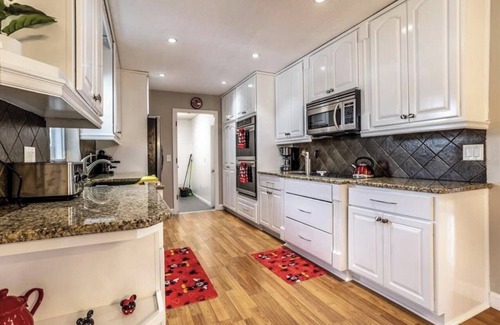 Our family room is furnished with two couches where you can all cozy up in front of 50 inch smart TV with free Netflix for all your favorite shows and movies as well as 100 free channels for you. If you like being outdoors enjoy our furnished patio area with pool. pool table, and backyard. Enjoy our elegantly furnished master suite with a king bed, private bath and 42 inch smart TV. Bedroom number two offers two bunk bed with two on top and bottom twin beds with a 42 inch smart TV and an additional pullout bed in the Living room sofa. Bathroom amenities include body wash, shampoo, body cream, conditioner, and bar soap. As well as, hair dryer and iron with ironing board. Additional amenities include a security system and surveillance video camera and doorbell for your security. Cameras are placed in pool area and corner of the property. There are specific plastic-glass looking cups for the pool time.
