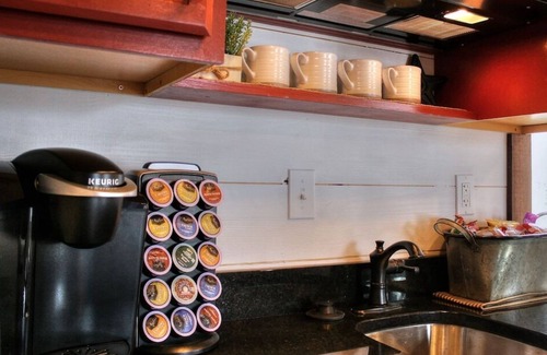 The Red Barn Guest House is a beautifully remodeled home with amazing details that makes this vacation rental truly unique! Sleeping 6 guests, this home has stone and ship-lap walls, walnut beams and ceilings, and wide plank flooring that gives it an authentic and upscale barn feel.