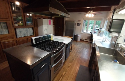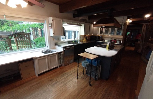 Reservations include a large main kitchen off the dining room perfect for cooking meals for large groups. The nearly commercial kitchen includes a large sink, small sink, double oven, commercial-size fridge, additional residential side-by-side fridge/freezer, and large microwave. Dishes, utensils, and a variety of cookware are provided. There is also a guest laundry room.