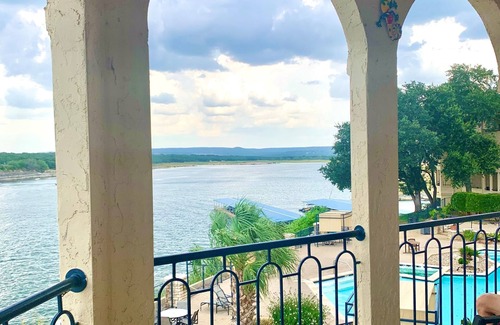 Casa Diana is a corner unit villa with an incredibly private balcony offering a 180-degree view of the main body of Lake Travis. Our unit juts out toward the lake and the views are stunningly beautiful. The bedroom has a soaring 2 story ceiling with walls of windows overlooking the lake. Enjoy dining al fresco on the balcony while enjoying a fabulous sunset view over the lake. This is by far one of the best, most private balcony locations on the Island and is closest to the lake, pools, hot tubs, gym and restaurant. This particular unit is located directly across the lake from the popular cliff jumping and slack lining (walking on tight ropes over cove) area of Pace Bend Park. The beautiful limestone cliffs and rocky coves can be accessed via kayaks and or stand up paddles boards. It is so much fun to watch the cliff divers/jumpers from our balcony. Pace Bend Park has nine miles of undeveloped shoreline on Lake Travis and is one of the most popular areas in the Highland Lakes region. Our unit is facing the main body and is located on a very deep stretch of the lake with gorgeous limestone bluffs so our view is spectacular.