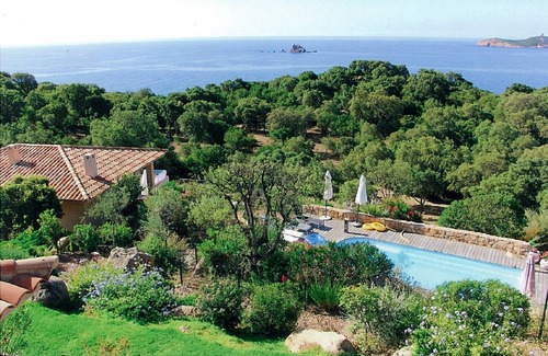 Villa with exceptional view over the bay of Pinarello (Pinareddu), the rock of Ruscana and its Genoese tower. This villa is located in a private park of cork oaks overlooking a confidential rocky cove with private access (driveway). Private heated swimming pool closed and alarmed. Linens and towels included as well as 2 hours of cleaning per week.